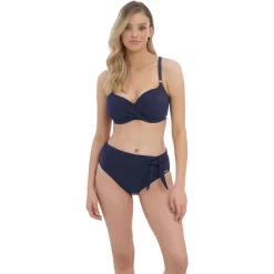 On adore la ceinture Ă rabat et la nouette au niveau de la taille de cette Culotte de bain Taille Haute Bleue OTTAWA de Fantasie Bain.