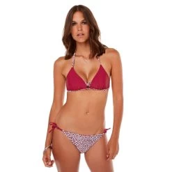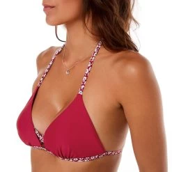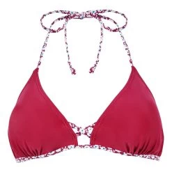 Haut de maillot triangle avec coussinets amovibles. On aime son look uni associé à un imprimé marguerites apposé en touches (bretelles, sous poitrine, entrebonnet). Liens dans le cou et dans le dos. Médaille BB de couleur argentée sur le côté droit. Un joli modèle proposé du 36 au 42.