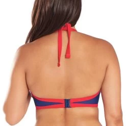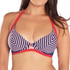 Ce soutien-gorge triangle est caractérisé par un motif à rayures blanches, bleues et rouges sur les bonnets et l’entre-sein, lui procurant un air marin.