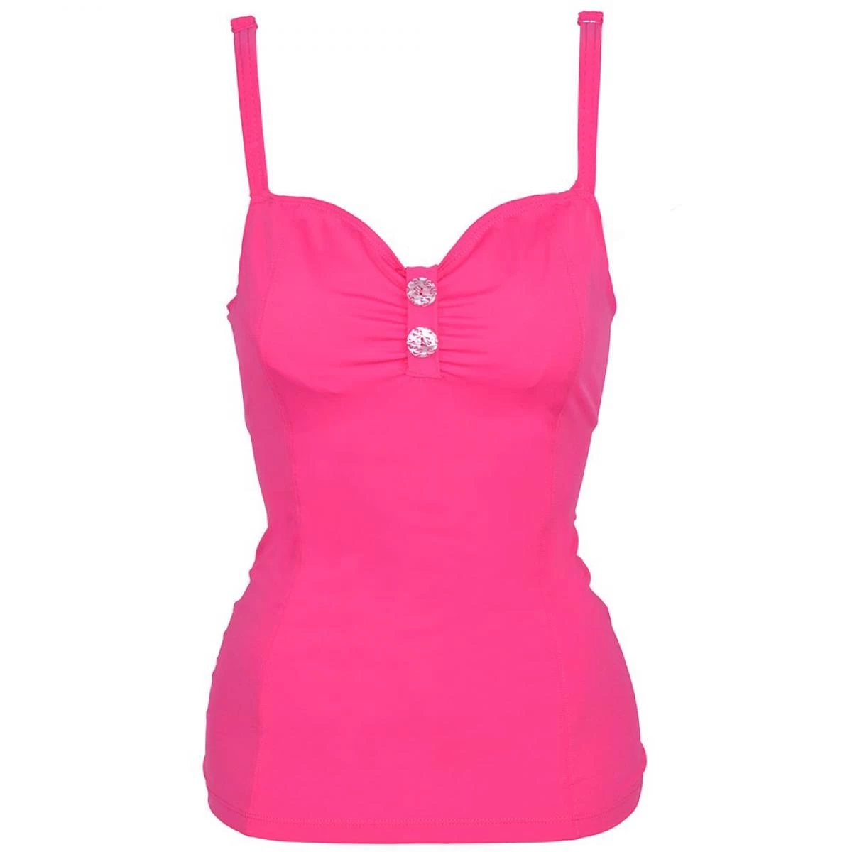 Ce joli tankini rose vif fait parti de la ligne Luau Love proposée cette année en coloris noir ou rose par la jeune marque anglaise Curvy Kate ! Ce débardeur de bain possède un soutien-gorge complet intégré, cousu sous la maille microfibre du tankini. Ce soutien-gorge possède des armatures sous poitrine et des agrafes à l’arrière. Il est composé d’une matière douce, très légère, élastique qui n’est pas désagréable au porté et qui a pour qualité de sécher rapidement. Les bonnets du tankini sont décorés d’une petite bandelette de tissu qui vient froisser l’entre-bonnets, créer un léger décolleté. Celle-ci est décorée de deux jolis boutons nacrés aux motifs léopards roses. Les bretelles sont assez épaisses pour vous garantir le meilleur confort possible tout au long de la journée, elles sont réglables à l’arrière. De chaque côté du débardeur au niveau du bassin, on retrouve deux petits liens élastiques qui viennent froncer et raccourcir à votre guise la longueur du tankini. Cela créé de petits plis sur le tissu du ventre qui peuvent ainsi gommer les quelques petites imperfections du ventre. Ces liens élastiques se nouent avec un petit noeud dès plus féminin. Craquez pour le tankini Luau Love de chez Curvy Kate !